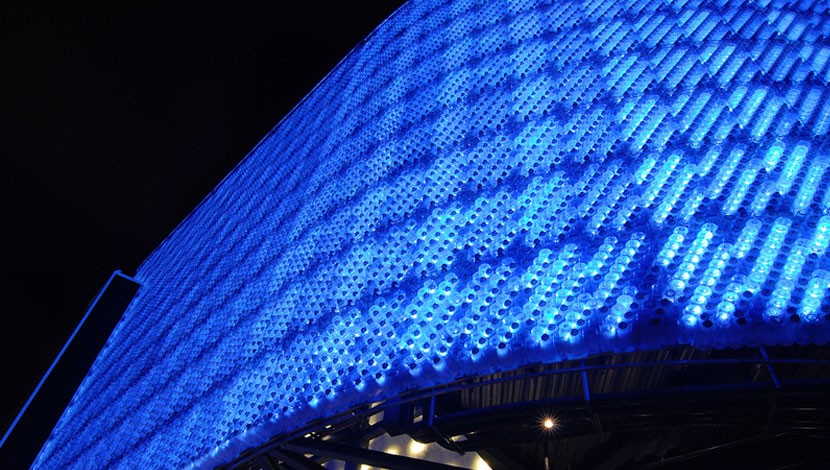 Pfandsysteme hin oder her. Alleine in Deutschland wandern jährlich rund 800 Millionen Plastikflaschen in den Müll. Und weltweit hat sich die Nachfrage nach PET seit dem Jahr 2000 verdoppelt. Warum aus diesem Plastikmüll nicht den Baustoff der Zukunft machen, dachte sich der taiwanesische Stararchitekt Arthur Huang und schuf die Polli-Bricks. Diese sechseckigen Einheiten werden aus recycelten PET-Flaschen hergestellt. Sie sind aufgrund ihrer wabenförmigen Grundfläche extrem belastbar, sind feuerhemmend und wirken Dank der eingeschlossenen Luft wie eine Dämmung. Tagsüber lassen die Polli-Bricks Licht hinein, nachts können mit LEDs farbige Wände entstehen. In Taiwan schuf Arthur Huang den neun Stockwerke hohen ecoARK Pavillon aus über 1,5 Millionen alter Plastikflaschen, die an eine Stahlkonstruktion montiert wurden. Mittlerweile ist sein CO2-neutraler Baustoff so begehrt, dass er eine eigene Produktionsfirma gegründet hat.